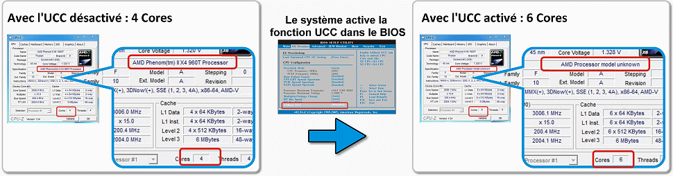 Révez vous d'upgrader votre système sans coût supplémentaire ? Bien entendu ! A la différence des cartes mères classiques, la gamme des cartes ASRock UCC établit un nouveau standard dans l'utilisation des cartes mères. La fonction ASRock UCC (Unlock CPU Core) permet à l'utilisateur d'activer les cores supplémentaires du CPU grâce à une simple option dans le BIOS. L'activation des cores est simplifiée et les performances sont boostées instantanément.Sur certains processeurs le cache L3 peut même être porté à 6 MB. Nous avons intégré la fonction ASRock UCC sur les cartes mères de la gamme AMD 8xx mais également sur la gamme Nvidia N68.