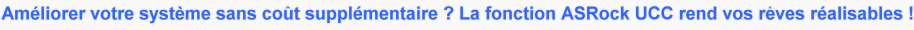 Chez ASRock, nous prenons notre engagement au sérieux. En intégrant de nouvelles technologies comme la fonction UCC au sein du plus grand nombre de produits possibles, ASRock continue à définir les standards technologiques de demain et à les rendre accessibles au plus grand nombre.