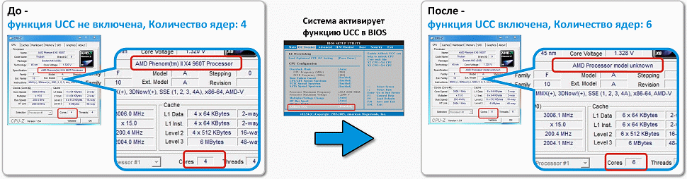 Вы мечтаете о бесплатном апгрейде компьютер? Конечно! Материнские платы серии ASRock UCC вводят новые стандарты! Они открывают новые возможности апгрейда при помощи функции ASRock UCC (Unlock CPU Cores) в BIOS, которая позволяет переделать процессоры Х2/Х3 в Х4. Функция ASRock UCC облегчает активацию скрытых частей процессоров AMD. Простой переключатель «UCC» в BIOS позволяет активировать заблокированное ядро процессора и наслаждаться бесплатным приростом производительности. В дополнение, у некоторых процессоров можно активировать скрытую кэш-память L3 (до 6 Мбайт). Мы активировали UCC не только на платах AMD 8xx, но и на платах серии NVIDIA N68.