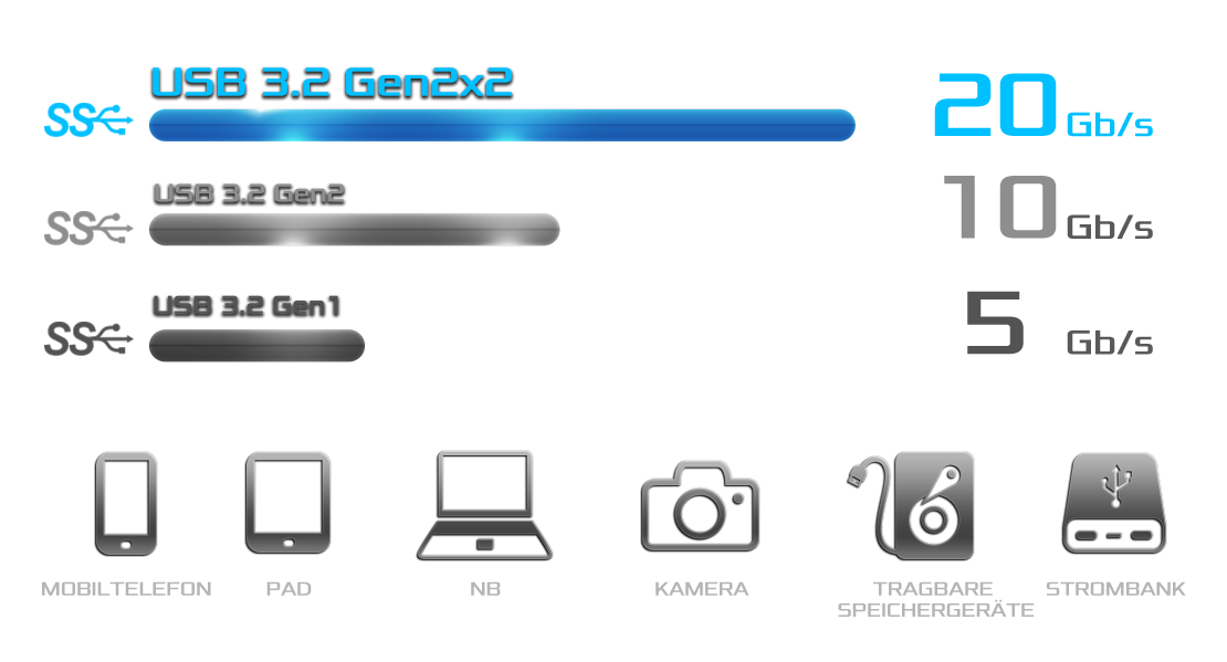 Ermöglicht eine Datenübertragungsrate von bis zu 20 Gbit/s, was doppelt so schnell ist wie die vorherige Generation, und bietet somit eine rasend schnelle Schnittstelle für die Datenübertragung mit verdrehsicherem USB Typ-C Design.
