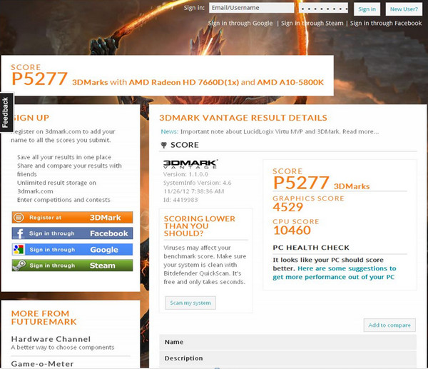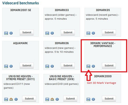 4. If you already installed the "3DMARK VANTAGE" software, please click "Submit" in the "3DMARK VANTAGE-PERFORMANCE" to upload your score. If you do not install the "3DMARK VANTAGE" software,