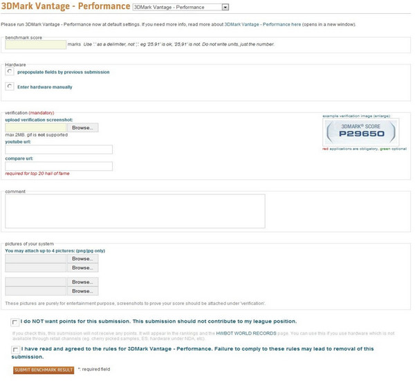 14. Please fill in the information (as below) and click "SUBMIT BENCHMARK RESULT" to upload your 3DMark Vantage - Performance score to HWBOT.