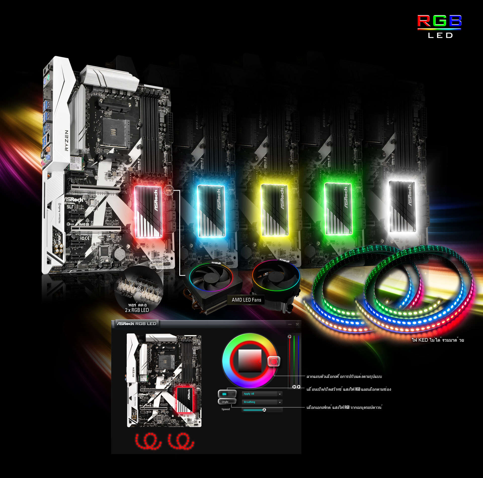 • สนับสนุน AMD ซ็อกเก็ต AM4 A-series APUs (Bristol Ridge) และซีพียู Ryzen series (Summit Ridge & Raven Ridge)