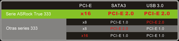 Las placas base de la Serie ASRock True333 pueden ejecutar PCI-E para tarjeta gráfica, SATA3 y USB 3.0 a toda velocidad al mismo tiempo. Sin embargo, otras placas base de la serie 333 sólo se pueden ejecutar uno de ellos a toda velocidad al mismo tiempo. ¡Si usted es un usuario con ojos de águila que busca informática emocionante verdad, es hora de probar una placa base de la Serie ASRock True 333!