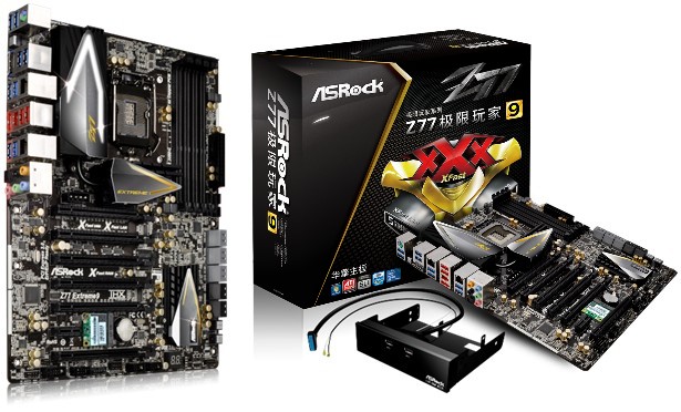 Z77 主板系列中的重装旗舰版 : Z77 极限玩家9结合炫丽设计、顶级用料、惊人效能与众多功能, 透过 PLX PEX 8747 桥接芯片支持 4-Way SLI/CrossFireX, 让进阶玩家及超频高手们尽情享受该板极致且卓越的效能。