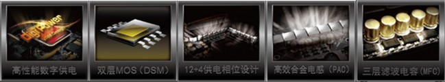 稳定的电流供应是超频主板的重要支柱, Formula 电源模块 内含5种稳定的供电解决方案, 助您超频一臂之力。Digi Power 高性能数字供电设计采用 CHIL 8328 芯片组, 支持数字 PWM供电, 能更流畅地提供 CPU Vcore 电压;双层堆栈MOSFET (Dual-Stack MOSFET) 以双层硅芯片, 采立体堆栈式设计, 创造更低的Rds(on), 提供更好的 CPU 供电效率。相较于旧式铁粉芯电感, 新式高效合金电感(Premium Alloy Choke) 强调其特殊合金配方, 能将铁损情况有效降低 70%, 而三层滤波电容 (Multiple Filter Cap) 使用三种不同滤波电容, 包括MLCC、POSCAP及DIP 电容, 分别协助过滤高、中、低频噪声, 提供 CPU更干净的电源。强大的 12 + 4供电相位设计 (12 + 4 Power Phase Design) 则可有效降低每相电源负荷, 缔造更高超频极限。