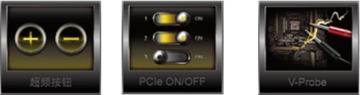 除3大Formula Kit特色外, 「规格满溢」的 Z77 OC Formula还有更多内置的便利超频按键, 超频按钮 按钮可手动调整 CPU频率、BCLK 频率与 CPU Vcore 电压值, 取得最佳的超频表现。针对需要经常重新安装显示适配器的使用者设计的3组 PCIe ON/OFF 开关, 能轻松启用或停用 PCIe 插槽;超频玩家们还可利用 V-Probe 便捷地透过电表量得超频状态中正确的电压值。