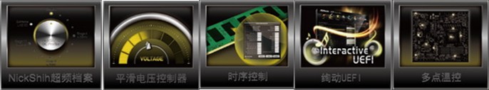 NickShih 的超频档案(NickShih's OC Profile) 内含超频教主的独家秘技, 能自动侦测 CPU, 提供不同超频等级的选项;想要追求极限的超频玩家们可透过 平滑电压控制器 (Fine-Tuning V-Controller) 功能, 体验更多电压设定选项;时序控制 (Timing Configurator) 中有许多细部 DRAM 设定值, 让玩家更便捷地进行进阶调整;华擎 绚动 UEFI是业界首创具有背景音效、视觉动画的 UEFI 设定画面, 以更生动活泼的操作接口, 为用户增添设定乐趣。此外, 使用者更可在 UEFI 设定和 Formula Drive中透过多点温控 (Multi-Thermal Sensor) 的图形接口, 追踪和控制主板不同部分的温度。