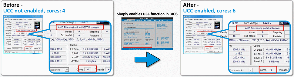Do you desire for the free upgrade? Of course, you do! Different from the traditional motherboard, ASRock UCC series motherboard makes a new definition of how a motherboard will be used! It is a new upgradeable motherboard usage that users enable the ASRock UCC (Unlock CPU Cores) feature in BIOS, and the CPU cores might be upgraded from X2/X3 to X4, and X4 to X6. ASRock UCC simplifies AMD CPU activation. Just a simple switch of the BIOS option ‘UCC’, you can unlock the extra CPU core to enjoy an instant performance boost. Additionally, some CPU can even increase L3 cache size up to 6MB. Not only on AMD 8xx series motherboards, have we implemented the UCC feature on entry Nvidia N68 series motherboards as well.
