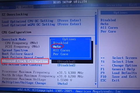 Second Step: Choose the "OC Tweaker" page and "Advanced Clock Calibration" option. Set the option to [Auto] as shown, and press F10 to save and exit.