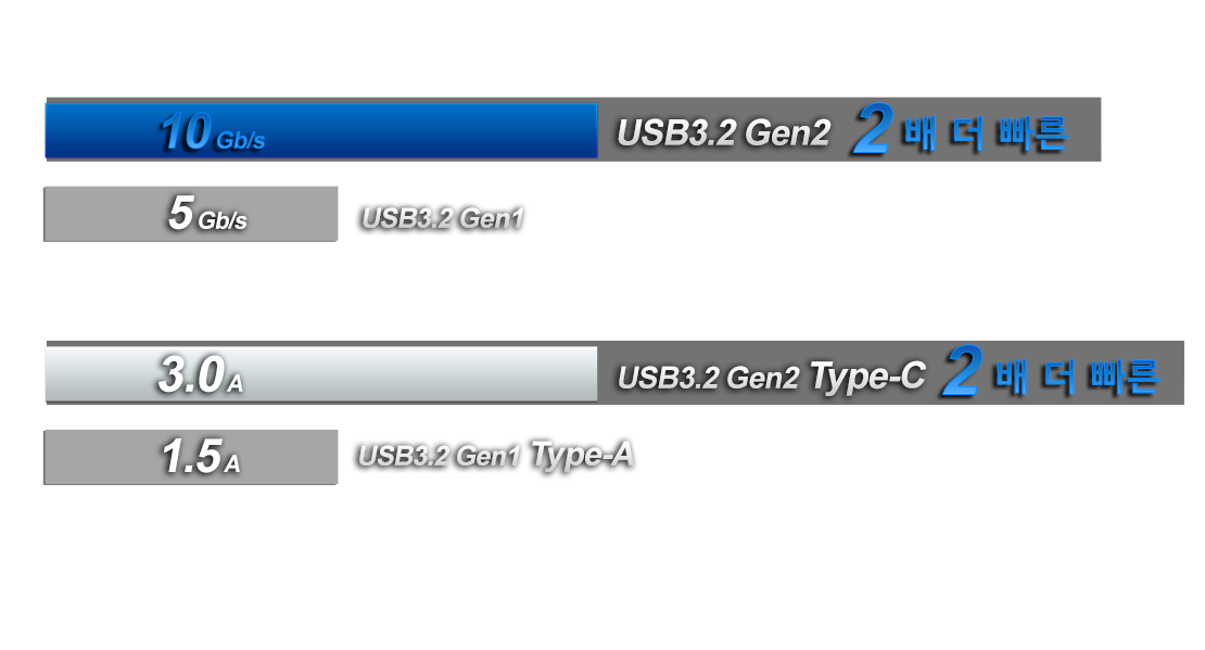 이전 세대보다 2배 빠른 최대 20Gbs의 데이터 전송 속도를 제공하여 리버서블 (양면으로 사용가능한) USB Type-C 디자인으로 초고속 데이터 전송 인터페이스를 제공합니다.