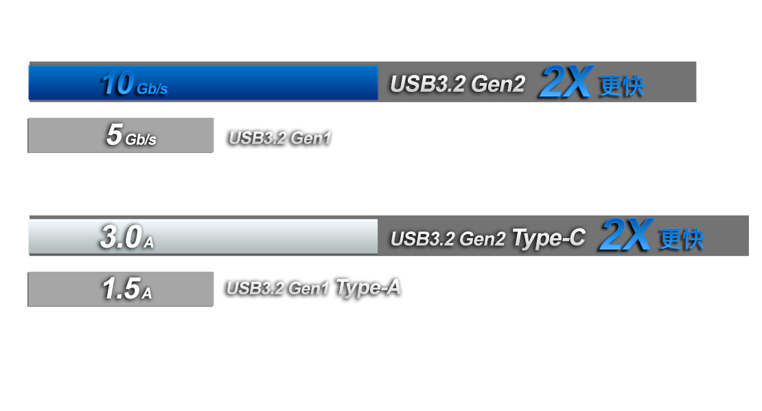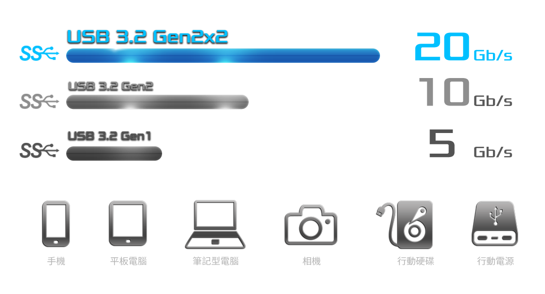 USB Type-C擁有高於前代產品2 倍,高達 20 Gbps 的數據傳送頻寬。