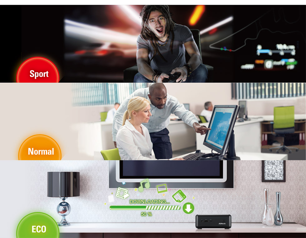 Toggle between three operational modes (Eco, Normal and Sport) to maximize performance or conserve energy. Use Eco mode for saving power during torrent downloads or other light activities, normal mode for regular tasks such as web surfing or word processing, and then shift to Sport mode to take on heavy jobs such as gaming or 4K video playback.