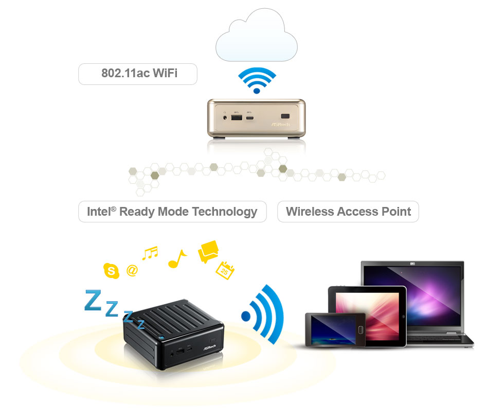 Beebox comes with an exclusive 802.11ac WiFi (2.4G/5G WiFi) module and also works as a wireless access point. With Intel® Ready Mode Technology (RMT), Beebox may remain silent, display off, but still actively receive incoming emails, updates, social media alerts, and continue to serve as a wireless access point while minimizing power consumption.