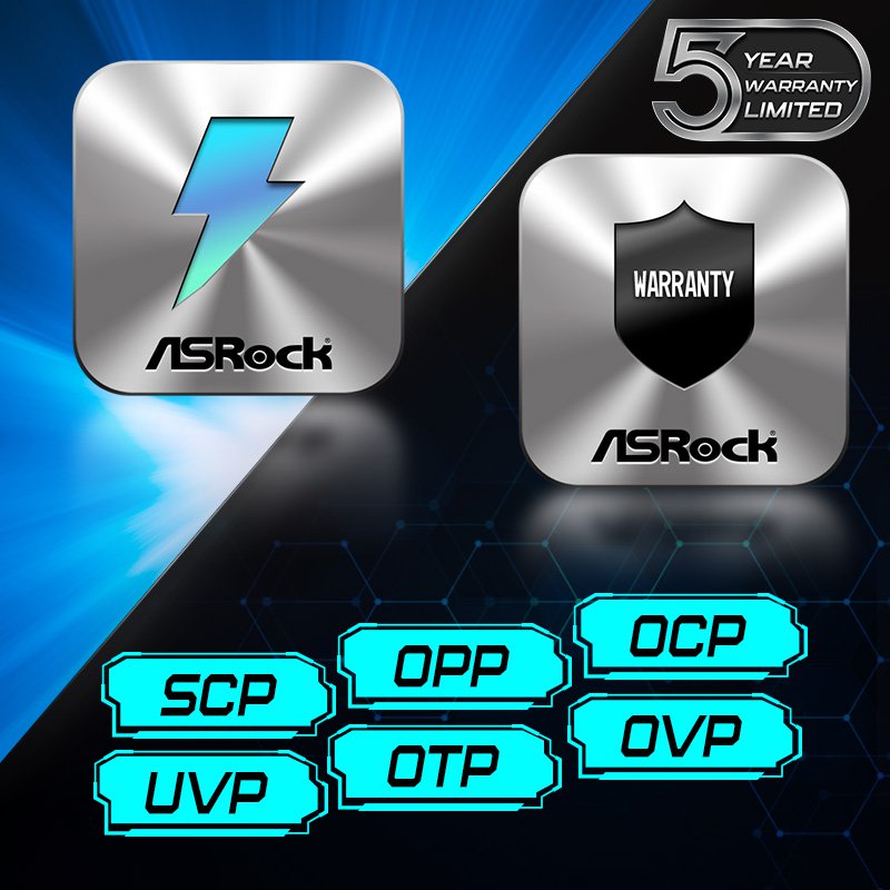 Full suite of protections to keep all components safe during normal to extreme power levels. ASRock offers an outstanding 5 –Year warranty, guaranteeing long term reliable and peace of mind operation.