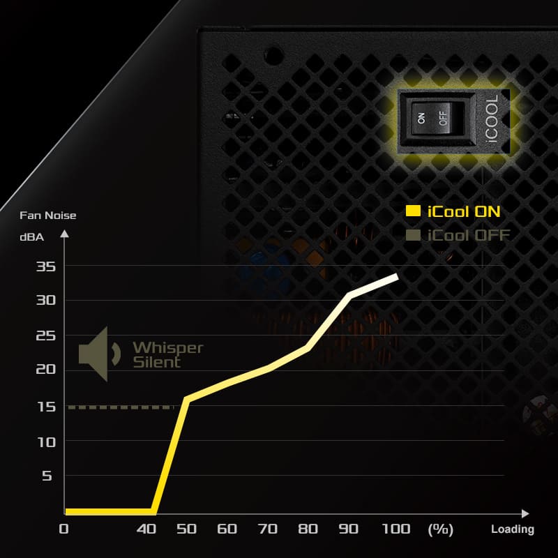 ●iCOOL Mode ON: The power supply runs more efficiently. The fan stays off during low to medium loads, reducing noise and improving energy efficiency. The fan only activates when the load or temperature increases. ●iCOOL Mode OFF: The fan runs continuously, regardless of load. This may increase noise slightly but provides consistent cooling and better performance under heavy loads.