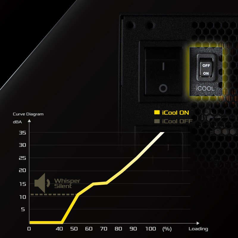 ●iCOOL Mode ON: The power supply runs more efficiently. The fan stays off during low to medium loads, reducing noise and improving energy efficiency. The fan only activates when the load or temperature increases. ●iCOOL Mode OFF: The fan runs continuously, regardless of load. This may increase noise slightly but provides consistent cooling and better performance under heavy loads.