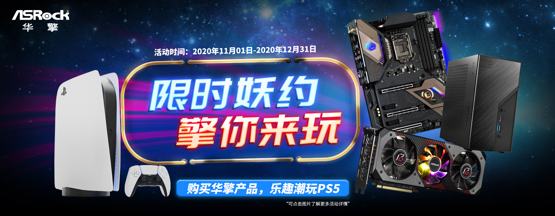 为感谢大陆区消费者对华擎产品的支持,华擎科技将于 2020 年 11 月 1 日起至 12 月 31 日举办“限时妖约,擎你来玩”——购买华擎产品,乐趣潮玩 PS5 的抽奖活动