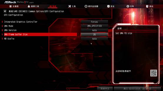 这次的APU最大的优势就是集成AMD Vega 8显卡,而且可以通过主板设置,共享2GB内存给GPU作为显存,设置的路径为:进入BIOS——高级——AMD CBS——NBIO Common Option——GFX Configuration。进入该界面后,按照上图所示就可以调整APU共享内存的大小,最大可设置2GB共享内存。