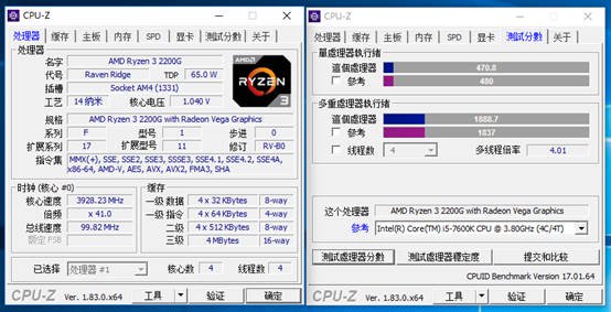 用CPU-Z自带测试软件对APU进行跑分测试,单线程为420,多线程为1688分。跑分成绩略比Intel i3 8100高一点。