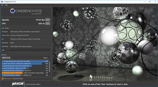 Cinebench R15的跑分测试分为两个部分,OpenGL为49.3fps;CPU为569cb,CPU性能和自家的Ryzen 3 1300X差不多。
