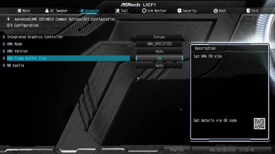 由于这款APU需要共享内存做为GPU显存,为了保证有更高的显示性能,要先设置显存大小,系统默认为1GB,最大可设置为2GB,具体设置如上图所示。