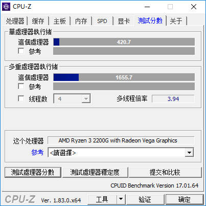 CPU-Z自带测试程序跑分:单线程420.7分,多线程1655.7分。