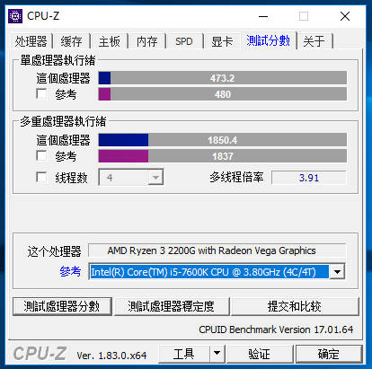CPU-Z跑分:单线程473.2分,多线程1850.4分。