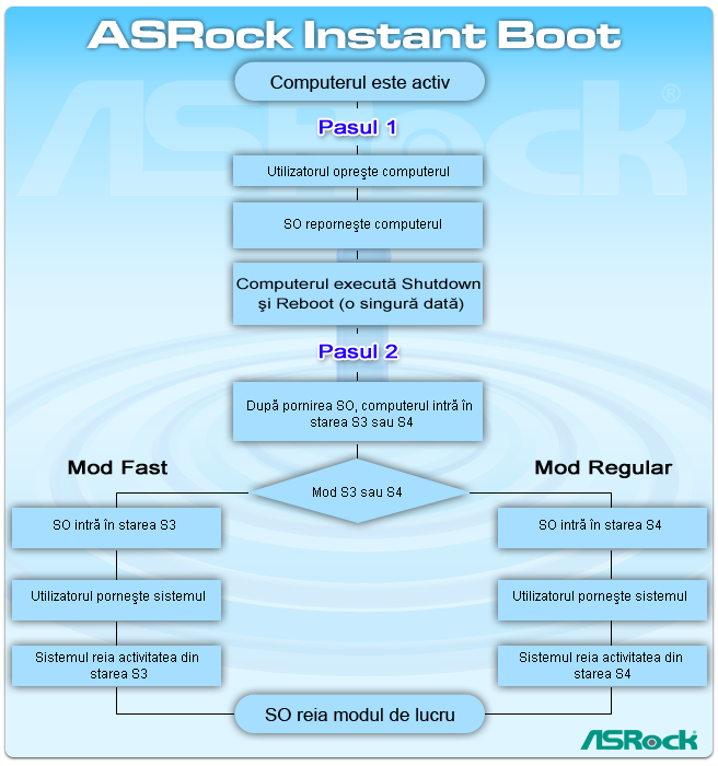 - ASRock Instant Boot asigură un sistem curat. S3/S4 va încetini sistemul, singurul avantaj peste rularea non-stop a acestuia fiind consumul redus de energie, în modul de sleep.