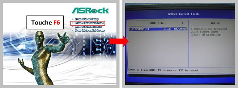 ASRock Instant Flash est un utilitaire de flashage du BIOS exclusif et convivial développé par ASRock. Il est directement intégré dans la ROM du Bios afin de ne pas avoir besoin d’accéder au système d’exploitation (MS-DOS ou Windows) pour procéder à la mise à jour du BIOS.
