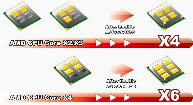 Do you desire for the free upgrade? Of course, you do! Different from the traditional motherboard, ASRock UCC series motherboard makes a new definition of how a motherboard will be used! It is a new upgradeable motherboard usage that users enable the ASRock UCC (Unlock CPU Cores) feature in BIOS, and the CPU cores might be upgraded from X2/X3 to X4, and X4 to X6. ASRock UCC simplifies AMD CPU activation. Just a simple switch of the BIOS option ‘UCC’, you can unlock the extra CPU core to enjoy an instant performance boost. Additionally, some CPU can even increase L3 cache size up to 6MB. Not only on AMD 8xx series motherboards, have we implemented the UCC feature on entry Nvidia N68 series motherboards as well.