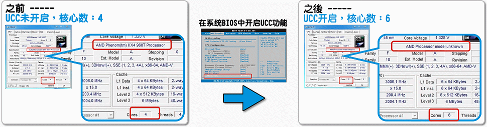 想免费升级您的系统吗?当然!与传统主板不同,华擎 UCC 系列主板定义了主板使用的新方法!这是一种全新的主板升级方式,用户只需在 BIOS 中开启华擎 UCC(Unlock CPU Cores)功能,CPU 核心即可从 X2/X3 升级为 X4。华擎 UCC 简化了 AMD CPU 的激活。只需简单开启 BIOS 选项 “UCC”,您就可以解锁额外的 CPU 核心,立即享受性能提升。此外,某些 CPU 甚至可以将 L3 缓存增大为 6MB。不仅是 AMD 8xx 系列主板,现在入门级的 NVIDIA N68 系列主板也支持 UCC 功能。