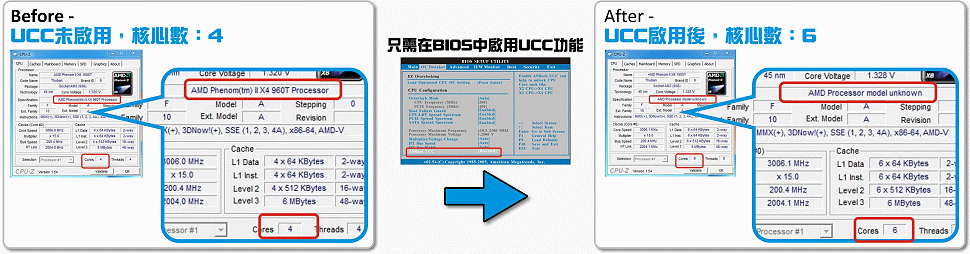 渴望免費的升級?當然,你想!不同於傳統的主機板,華擎UCC系列對於將主機板運用做了個新的定義! 這是一個新的升級主機板用法,使用者只需啟用BIOS的ASRock UCC功能,處理器的核心就能從雙核、三核變成四核。 華擎UCC功能簡化了AMD CPU的開核。 一個簡單的BIOS UCC開關選項,你就能開啟額外的CPU核心並馬上感受性能的提升。另外,某些CPU的L3快取甚至能增加至6MB。 華擎UCC功能不僅能用在AMD 8xx系列主機板,NVIDIA N68系列主機板也同樣適用。