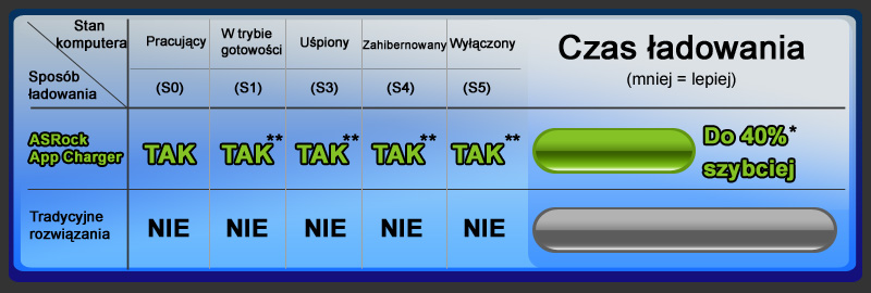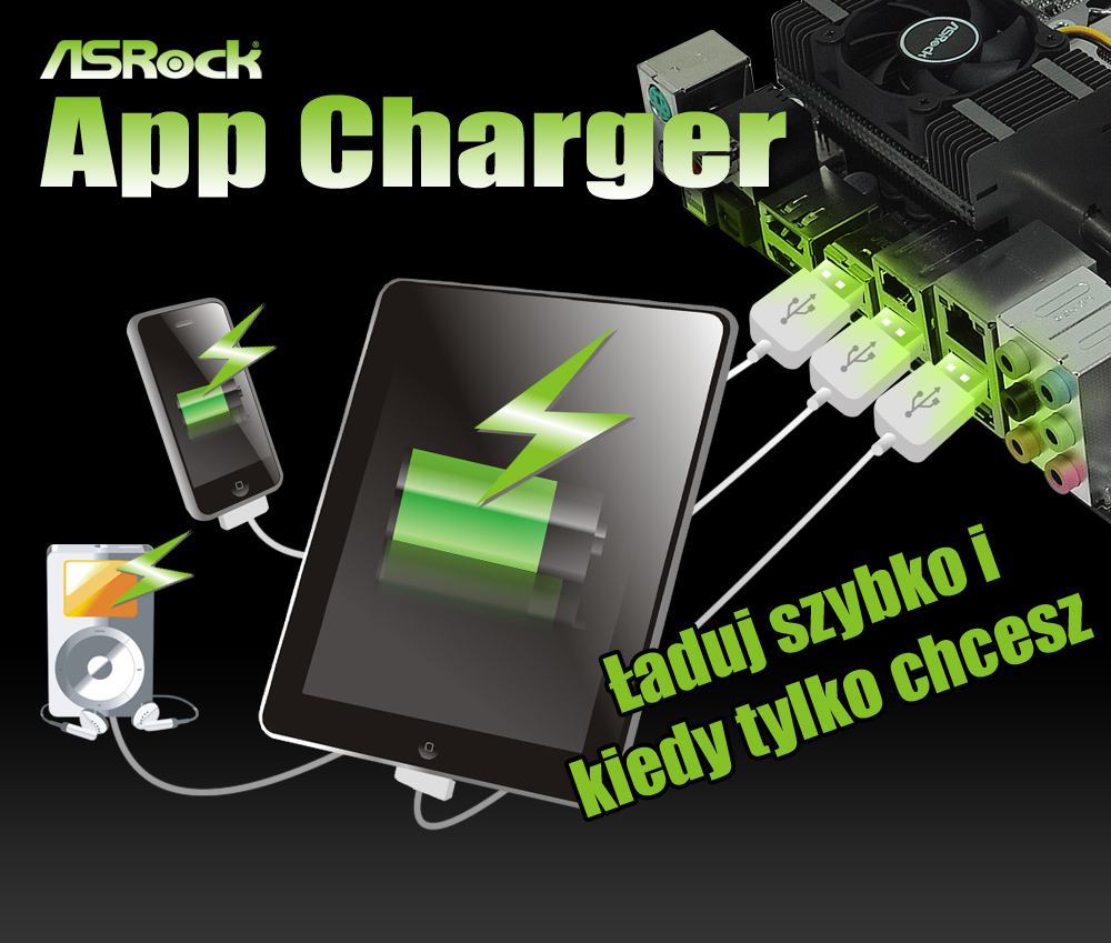 Jeżeli chcesz szybciej i bez dodatkowych ograniczeń ładować swoje urządzenia Apple, takie jak iPhone/iPod/iPad Touch, firma ASRock przygotowała dla Ciebie wspaniałe rozwiązanie - ASRock App Charger. Prosta instalacja sterowników App Charger sprawia, że ładowanie iPhona z komputera staje się nawet o 40% szybsze niż wcześniej*. ASRock App Charger pozwala ładować jednocześnie wiele urządzeń Apple nawet wtedy, gdy komputer jest w trybie gotowości (S1), jest uśpiony (S3), zahibernowany (S4) lub wyłączony (S5)**. Po zainstalowaniu sterowników App Charger poznasz zupełnie nowy sposób ładowania.