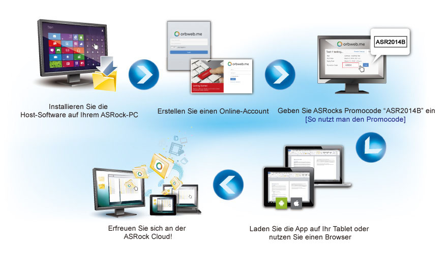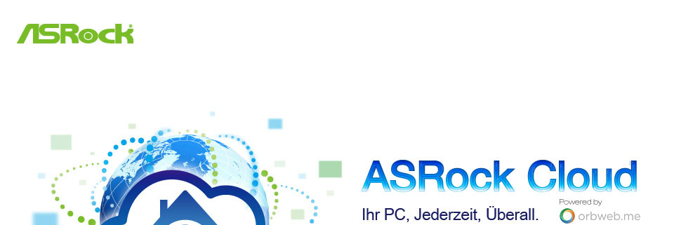 Die ASRock Cloud verbindet Ihr Mobilgerät nahtlos mit Ihrem PC und unterstützt verschiedene Geräte, die zeitgleich mittels File Explorer auf den Cloud-Service zugreifen können! Wir bieten eine einjährige Mitgliedschaft für Orbweb.ME Professional, einen persönlichen Cloud-Service im Wert von 49,99 US-Dollar pro Jahr. Dies ermöglicht es Ihnen eine Verbindung zum PC aufzubauen und aus der Ferne auf Dateien, Musik, Fotos und Videos zuzugreifen - jederzeit und überall. Dazu kommt ein einmonatiges Upgrade auf das Paket Orbweb.ME Ultimate mit einer Remote-Desktop-Funktion. Laden Sie jetzt Orbweb Me Host herunter und nutzen Sie den ASRock-Promocode ASROCK, der Kunden von ASRock einen Zugang zu all den genannten Services ermöglicht.