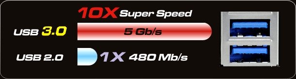 Avec un taux de transfert de données jusqu' à 5 Gb/s, la technologie USB 3.0 atteint des débits 10 fois supérieurs à ceux proposés par l'USB 2.0 avec une consommation d'énergie optimisée.