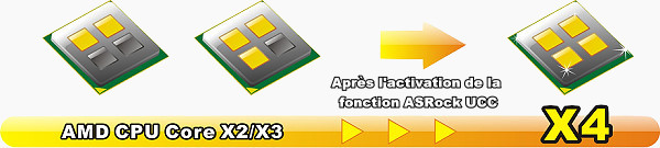 Révez vous d'upgrader votre système sans coût supplémentaire ? Bien entendu ! A la différence des cartes mères classiques, la gamme des cartes ASRock UCC établit un nouveau standard dans l'utilisation des cartes mères. La fonction ASRock UCC (Unlock CPU Core) permet à l'utilisateur d'activer les cores supplémentaires du CPU grâce à une simple option dans le BIOS. L'activation des cores est simplifiée et les performances sont boostées instantanément.Sur certains processeurs le cache L3 peut même être porté à 6 MB. Nous avons intégré la fonction ASRock UCC sur les cartes mères de la gamme AMD 8xx mais également sur la gamme Nvidia N68.