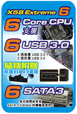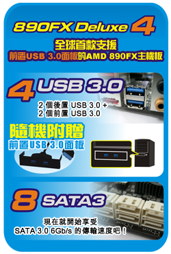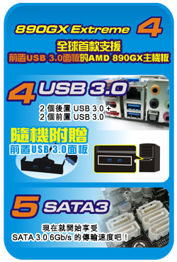 一直以來,華擎主機板總能為您帶來超出期待的驚喜。我們提供充足的 SATA、eSATA甚至是USB 3.0介面。在 Intel 平台方面,P55 Extreme4配備四個SATA3介面與四個SuperSpeed USB 3.0介面(二個位於附贈的前置USB 3.0面板,二個位於後側面板),它是世界上首款支援前置USB 3.0面板技術的主機板。在AMD平台方面,890FX Deluxe4與890GX Extreme4 同樣配備了四個USB 3.0介面,甚至提供了更多的SATA3介面!只需將前置USB 3.0面板連接到主機板上的USB 3.0排針及機箱,用戶即可享受這一便利的運算環境。