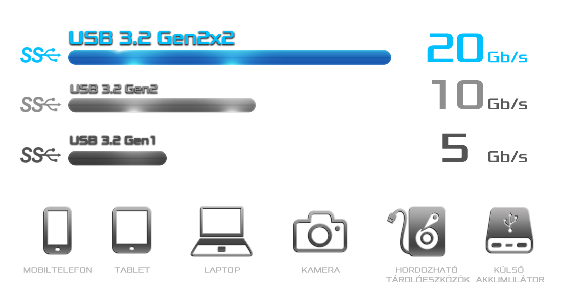 Akár 20 Gb/s adatátviteli sebességre is képes, ami 2x gyorsabb, mint az előző generáció, így villámgyors adatátvitelt nyújt megfordítható USB Type-C kialakítás mellett, amely mindkét irányban csatlakoztatható.
