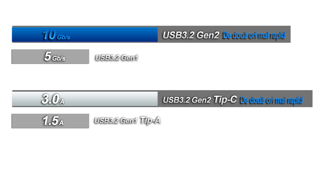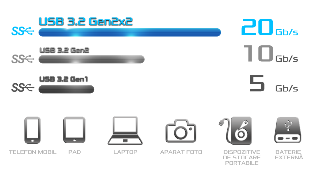 Oferă o rată de transfer de date de până la 20 Gbps, care este de 2 ori mai rapidă decât generația anterioară, oferind o interfață de transfer de date ultra rapidă cu design reversibil USB Tip-C.