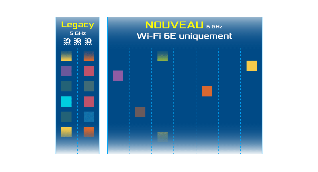La technologie WiFi 6E s'est étendue à la nouvelle bande de fréquences 6GHz, offrant ainsi plus de capacités WiFi et permettant un trafic internet encore plus stable et plus rapide. En plus d'offrir des vitesses plus élevées, le WiFi 6E améliore également la latence et supporte des niveaux de service équivalents aux réseaux 5G.