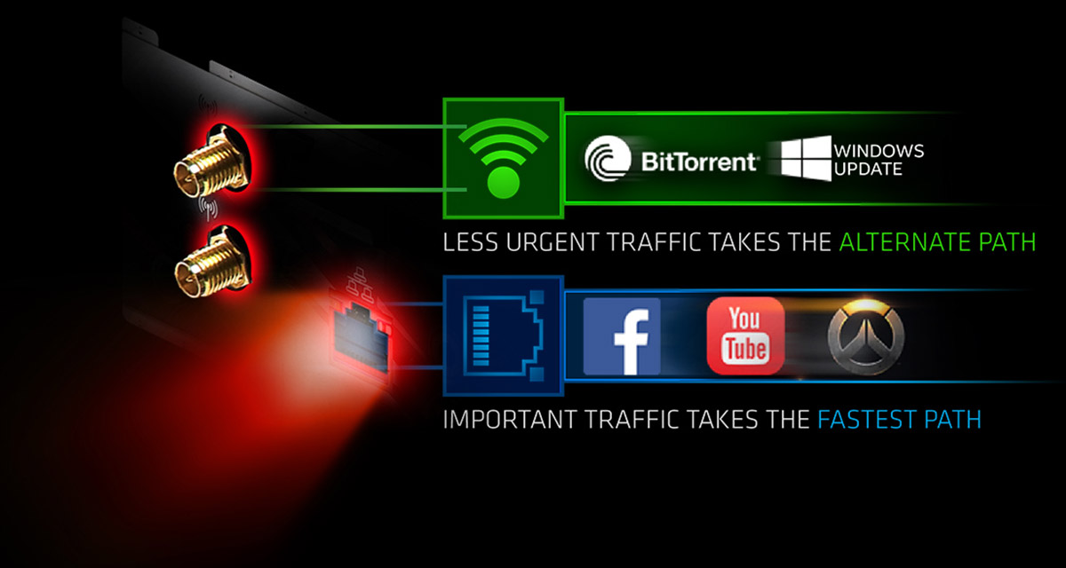 Killer DoubleShot Pro permet l'utilisation simultanée des interfaces Killer Wireless et Killer Ethernet, ce qui permet à l'utilisateur final de profiter d’un débit maximal de 4,9 Gbps. Cette solution utilise automatiquement la connexion réseau la plus rapide, ce qui garantit que le trafic le plus prioritaire sera toujours acheminé sur la liaison la plus rapide et la plus fiable.