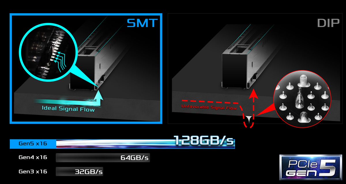 Comparé au slot PCIe conventionnel de style DIP, le slot PCIe de type SMT améliore la circulation des signaux et maximise la stabilité à haute vitesse, une avancée majeure pour supporter pleinement les débits supportés par la dernière norme PCIe 5.0, capable d’offrir une bande passante époustouflante de 128 Go/s et prête pour libérer tout le potentiel des futures cartes graphiques haut de gamme.