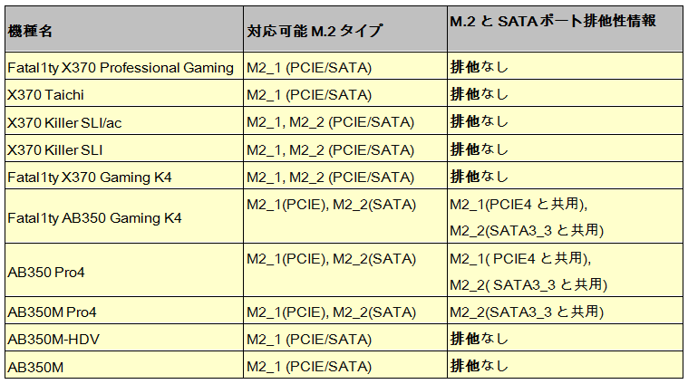 各AM4機種のM.2対応仕様が異なるため、詳細は下記の一覧表を御参考下さい。