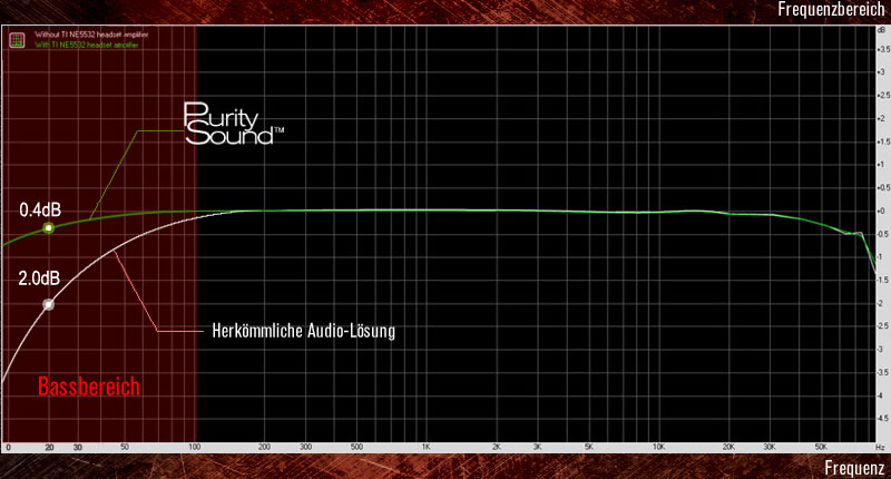 Dieser Chart zum Frequenzbereich wurde unter einer Last von 32 Ohm erstellt, um ein herkömmliches Headset zu simulieren. Es zeigt, wie der Frequenzbereich bei herkömmlichen Audio-Lösungen und niedrigen Frequenzen drastisch einbricht, während Purity Sound™ den Frequenzbereich stabil hält und mit dem Verstärker vom Typ TI® NE5532 bessere Bässe bietet. |