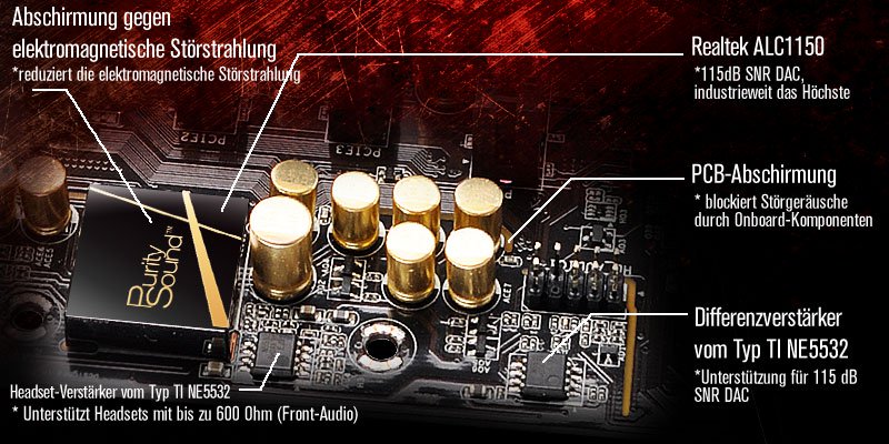 Purity Sound ist eine Kombination verschiedener Hardware- und Software-Lösungen, sowie speziellen Technologien, die selbst die anspruchsvollsten Audiophilen zufrieden stellen. Enthalten sind 7.1 CH HD Audio mit Unterstützung für den Audio-Codec Realtek ALC1150, 115dB SNR DAC mittels Umkehrverstärker, ein hochwertiger Umkehrverstärker (TI® 5532) für Headsets mit bis zu 600 Ohm, Abschirmung gegen elektromagnetische Störstrahlung, PCB-Abschirmung und Unterstützung für DTS Connect. |