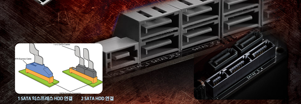 SATA 익스프레스* 인터페이스는 2세대 PCIe 2배속 (10Gb/s) 데이터 전송속도를 제공합니다. 이 마더보드는 최고의 성능을 즐기려는 매니아들을 위해서 최신 SATA 익스프레스 커넥터를 제공합니다.