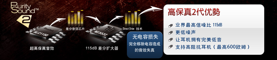 Purity Sound™ 2 는 리얼텍 ALC1150 오디오 코덱의 7.1 채널 HD 오디오, 차등 증폭의 115dB SNR DAC, TI® NE5532 프리미엄 헤드셋 앰프, 캡 리스 다이렉트 드라이브 기술, EMI 차폐 커버, PCB 분리 차폐 및 DTS 연결을 포함합니다. ASRock 은 Purity Sound™ 2 를 위해 이렇게 고품질의 캐패시터를 적용했습니다. |