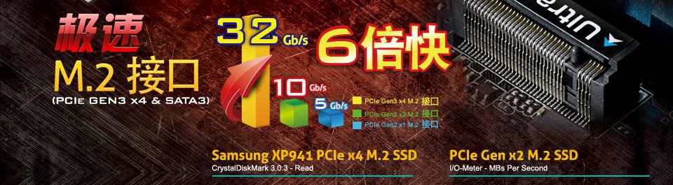 | 与其它M.2 相比, 超级M.2 直接从CPU支持PCIe Gen3 x4频宽,延迟率更低,速度更快。 |