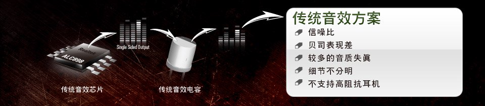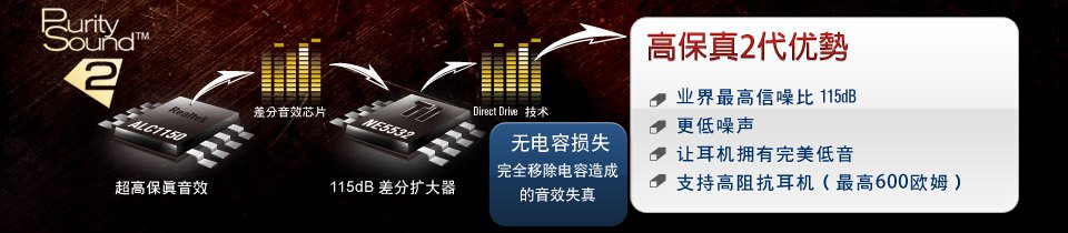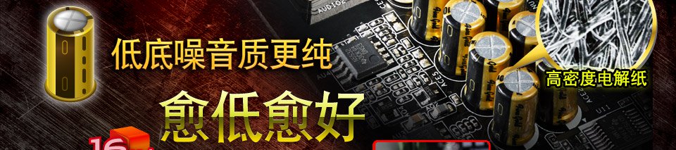 高保真2代技术包括基于瑞昱 ALC1150 音频编译码器的 7.1 声道高保真音频、带差分放大器的 115dB 信噪比数模转换器、无电容直接驱动技术、EMI 屏蔽盖、PCB 隔离屏蔽和 DTS Connect。而 Nichicon 专业音效电容可以显著降低噪声水平,甚至可以满足最挑剔音频发烧友的使用需求。 |